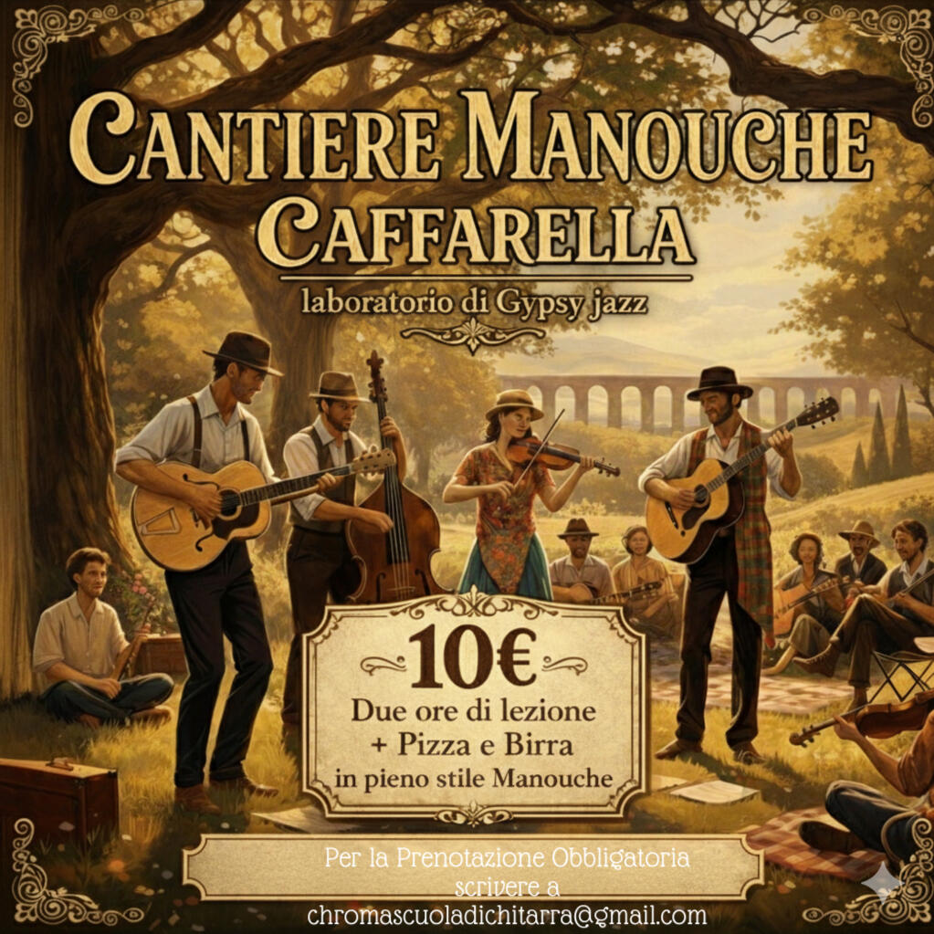 Intere mattinate dedicate allo studio dello stile Manouche immersi nel verde di uno dei parchi più suggestivi di Roma. Gli incontri si rivolgono a musicisti desiderosi di avvicinarsi allo stile ed alla tecnica del Gypsy Jazz e naturalmente di Django Reinhardt, in un contesto disteso e stimolante. Non preoccuparti del livello, iniziamo da ZERO. L'importante è che ti piaccia il Jazz Manouche e l'aria aperta! Al termine ci rilasseremo con Pizza e Birra 🍕 🍻!📋 Struttura dell'incontro: